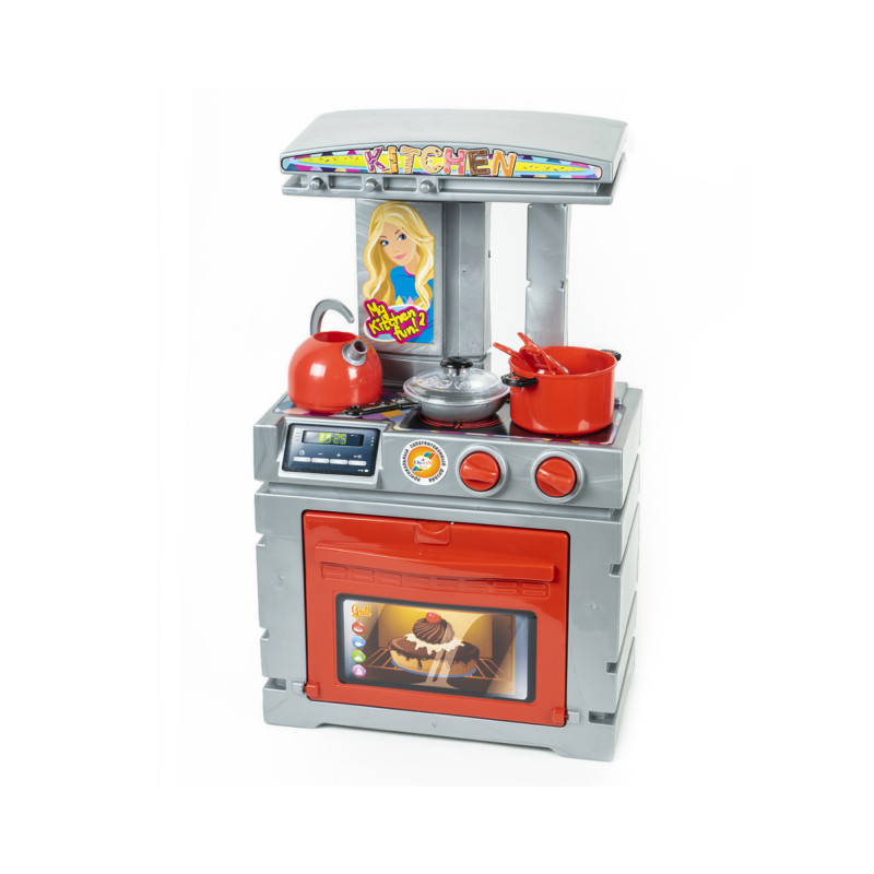 Эта крупногабаритная игрушка состоит из корпуса кухни, дверцы кухни и посуды. Дверцы кухни устанавливаются на корпус кухни, их можно открыть и закрыть на защёлку.Столешница кухни имеет имитированную электроплиту с двумя конфорками и две ручки управления, слева – место для складывания посуды. На стойке есть горизонтальная полочка с 3-мя цилиндрическими выступами для подвешивания кухонных принадлежностей – лопатки (или шумовки), картофеле-мялки и половника. Кухня оклеивается набором ярких наклеек, которые имитируют две конфорки, прозрачное стекло духовки и др. В корпус кухни вкладываются детали кухонного набора: кастрюля с крышкой, чайник, сковородка. Основные детали игрушки изготавливаются методом литья под давлением из полипропилена и имеют разные яркие цвета.