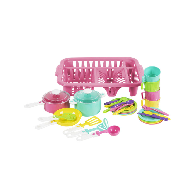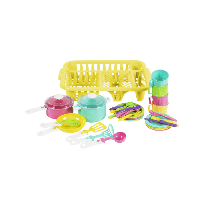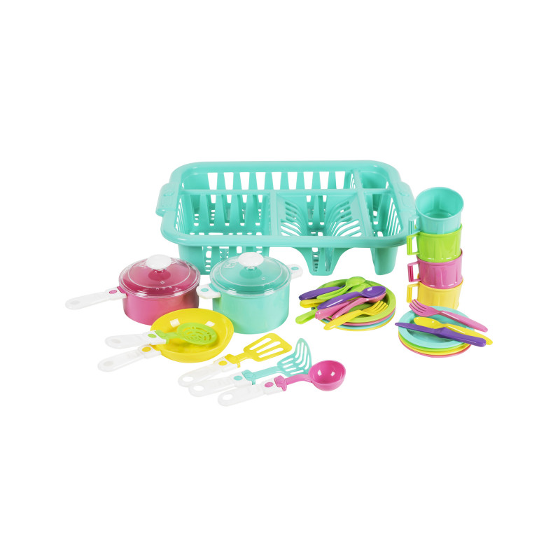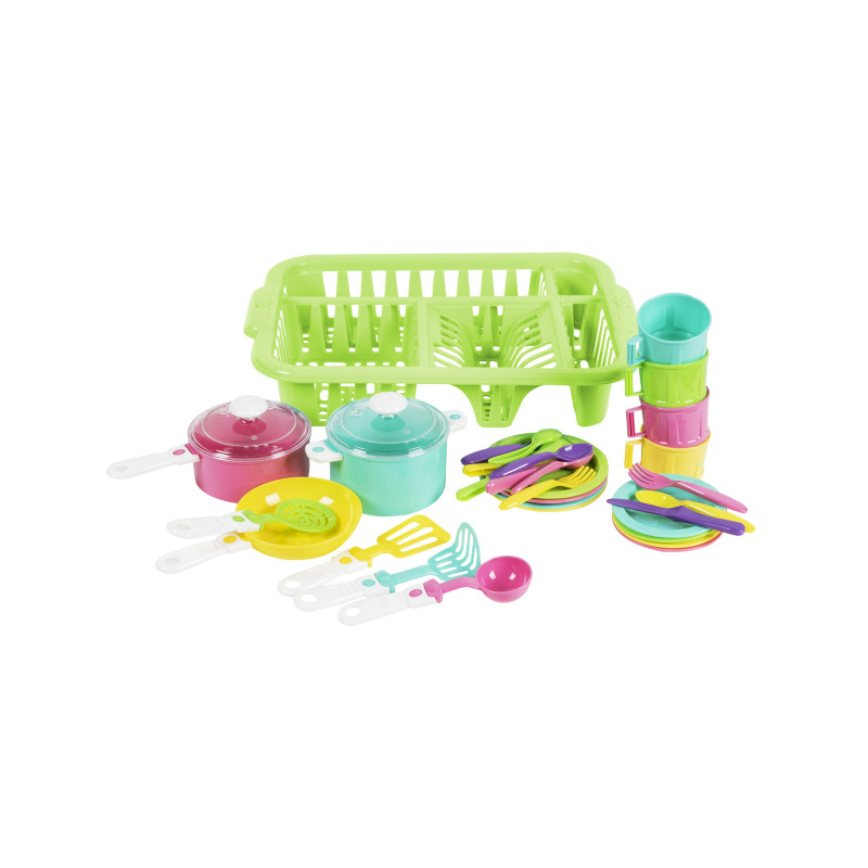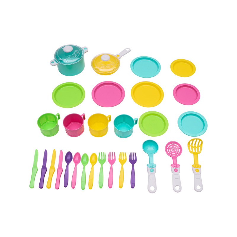Игрушка состоит из такой посуды: кастрюли и сотейника с прозрачными крышками, сковороды, 4 тарелки большие и 4 тарелки малые, лоток, 4 чашки, 4 ложки, 4 вилки, 4 ножа, лопатка, шумовка, картофеле-мялка, половник, которые вкладываются в пакет ПВХ и закрывается с помощью цветного стикера. Детали игрушки изготавливаются методом литья под давлением из полипропилена и имеют разные яркие цвета.