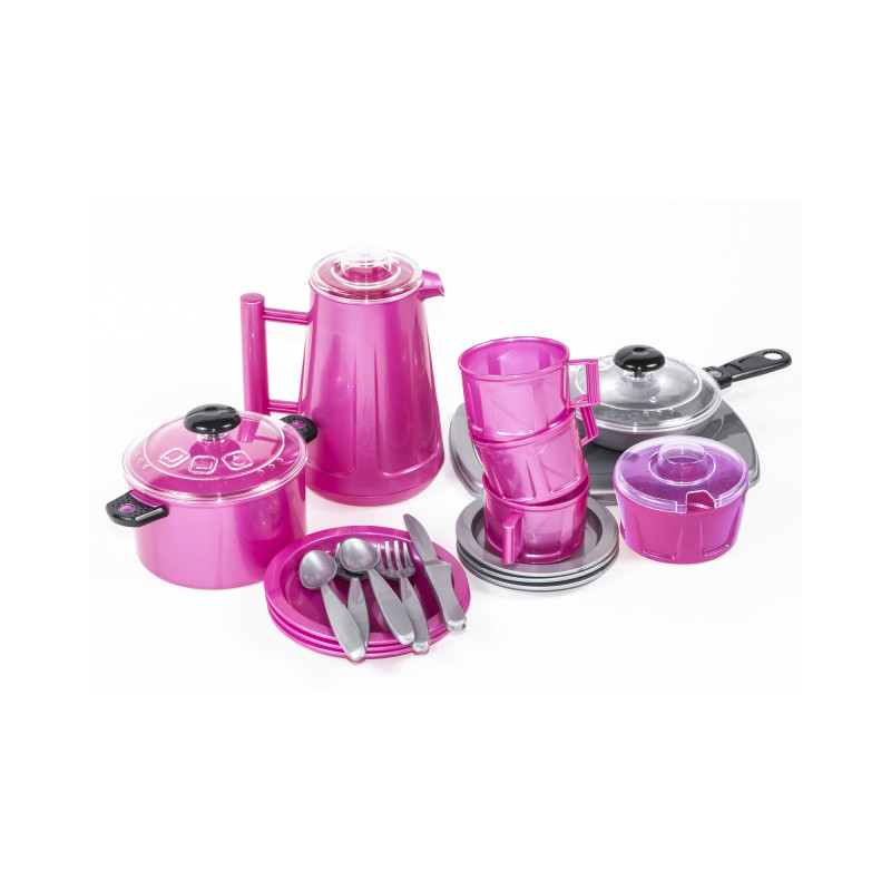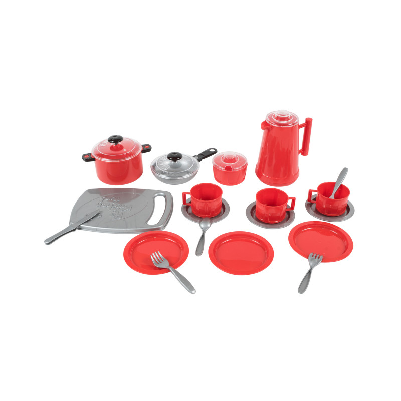 Игрушка состоит из такой посуды: кастрюли с прозрачной крышкой, сковороды, 3 тарелки большие и 3 тарелки малые, сахарница и кофейник с прозрачными крышками, 3 чашки, кухонная доска, 3 ложки, 3 вилки, 1 нож, которые вкладываются в пакет ПВХ и закрывается с помощью цветного стикера.
