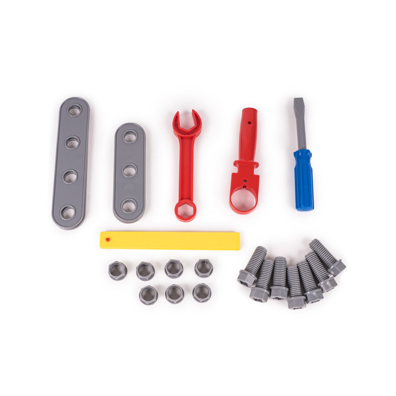 Набор предметов игрового обихода – набор игрушечных столярных инструментов и принадлежностей в чемодане, длина – 320 мм, ширина — 180 мм, высота – 145 мм, масса – 0,793 кг, потребительская упаковка – сетка полимерная. Игрушечный набор Маленький столяр отличается от предыдущей модели Маленький механик с арт. 921 только тем, что ножовка по металлу заменяется на пилу, плоскогубцы на клещи, добавляется еще рубанок, а вместо трех планок больших, трех планок малых, трех уголков есть только по два экземпляра.