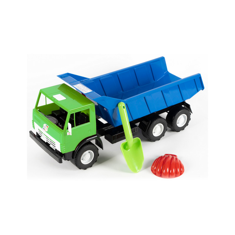 Грузовой самосвал состоит из шасси, на котором устанавливаются кабина и самосвальный кузов. С двух сторон кабина имеет два зеркала– левое и правое, спереди кабины – облицовка радиатора, а сверху кабины — люк. Внутри кабины есть трёхместное сидение. Три оси с колёсами устанавливаются на кронштейны шасси. Колёса имеют декоративные колпаки. Самосвальный кузов устанавливается на выступы в задней части шасси. Кузов откидывается и удерживается в таком состоянии. Игрушка может комплектоваться совком №1 (арт.719) и пасочкой (арт.702). Все детали изготавливаются методом литья под давлением из полипропилена.
