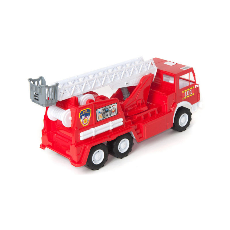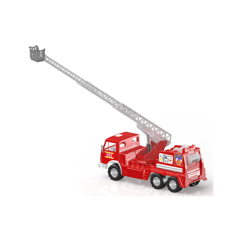 Игрушка транспортная – грузовик трёхосный с поворотной раздвижной пожарно-спасательной лестницей и люлькой, длина – 520 мм, ширина 190 мм, высота – 230 мм, масса – 1,03 кг, потребительская упаковка – сетка полимерная. Пожарная машина Х3 изготавливается на основе модели с арт. 443 Автомобиль Х3, описание которой было приведено выше, только вместо кузова на шасси устанавливается платформа с поворотной платформой. Раздвижная пожарно-спасательная лестница, собранная из трёх звеньев и люльки, устанавливается на поворотную платформу, поднимается и фиксируется с помощью гидроцилиндра. В не раздвинутом состоянии лестница укладывается на катушку, установлен-ную на платформу. Цилиндр, поршень, лестница изготавливаются из полимера АВС, остальные детали из полипропилена.