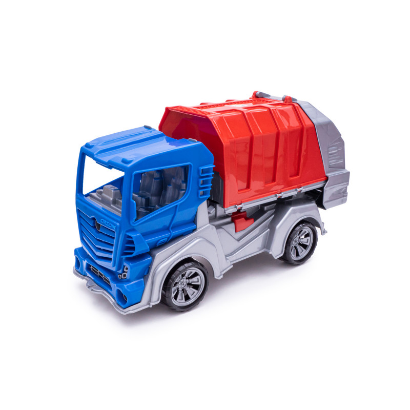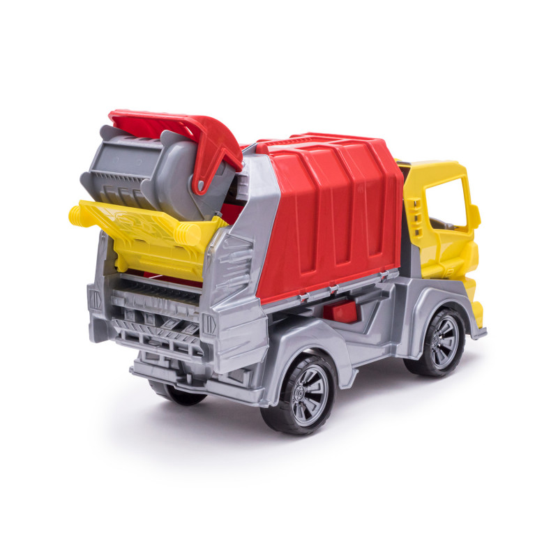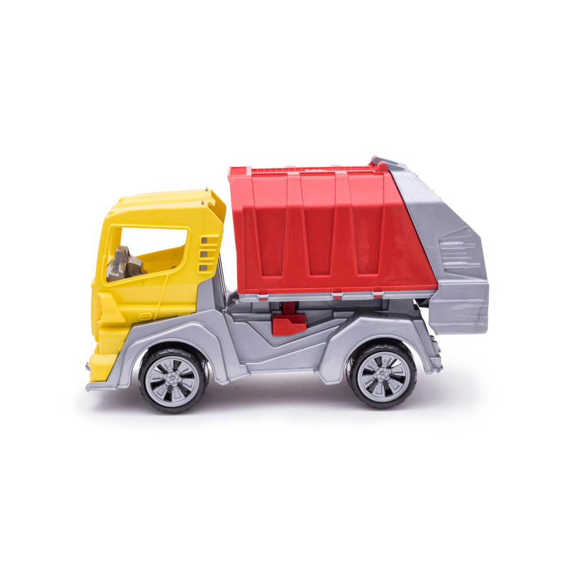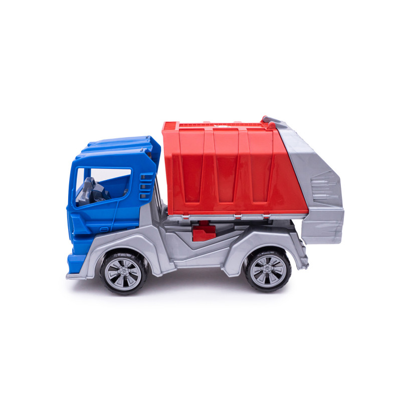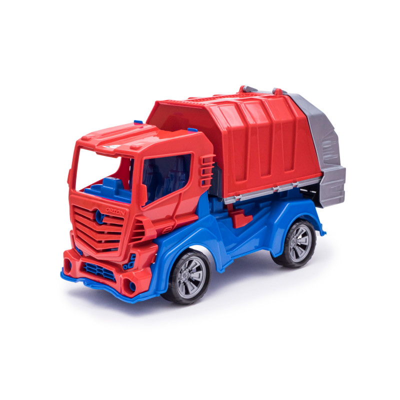 Данная модель игрушки изготавливается на основе предыдущей модели с арт. 018, но вместо кузова самосвала на шасси устанавливается платформа мусоровоза с крышкой и опрокидывателем. На опрокидыватель устанавливается и фиксируется контейнер для мусора с крышкой. Контейнер с крышкой с помощью ручек опрокидывателя поднимается, крышка контейнера открывается и мусор высыпается в кузов. Все детали изготавливаются из полипропилена.