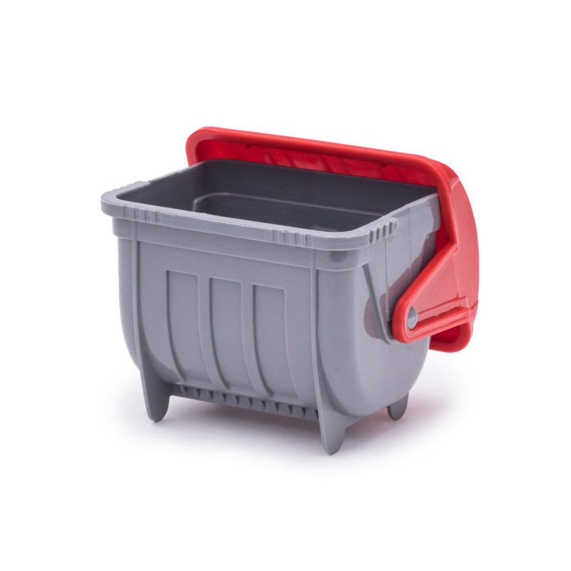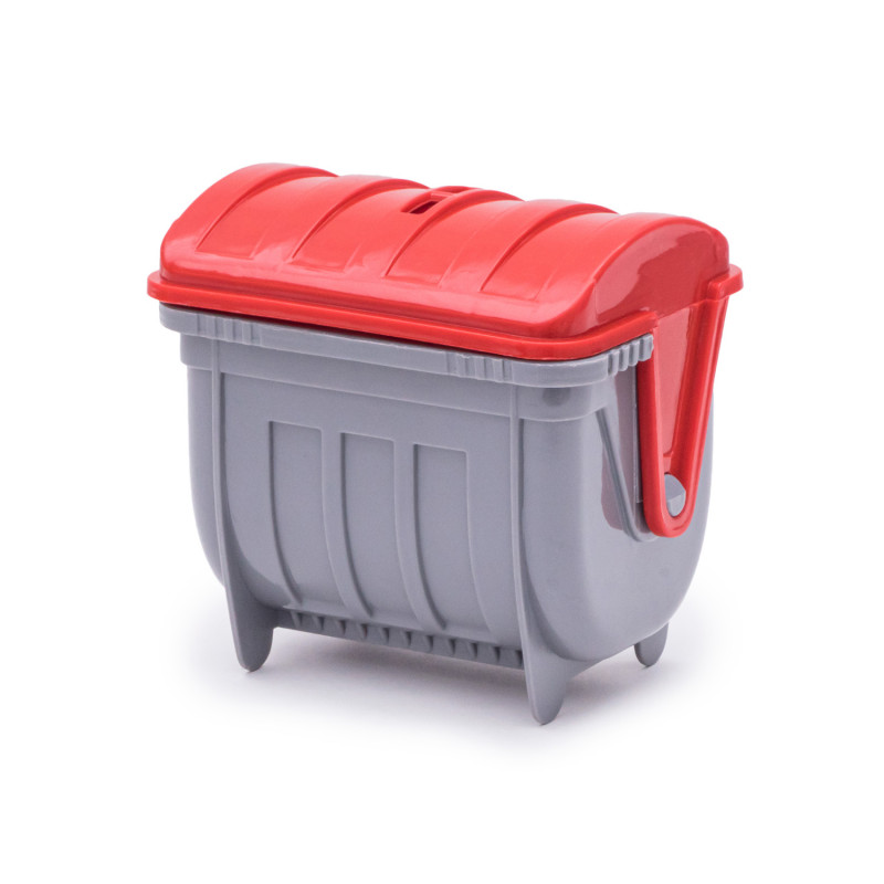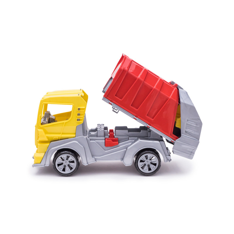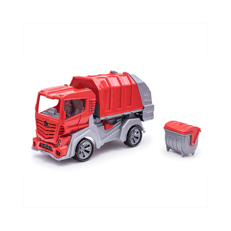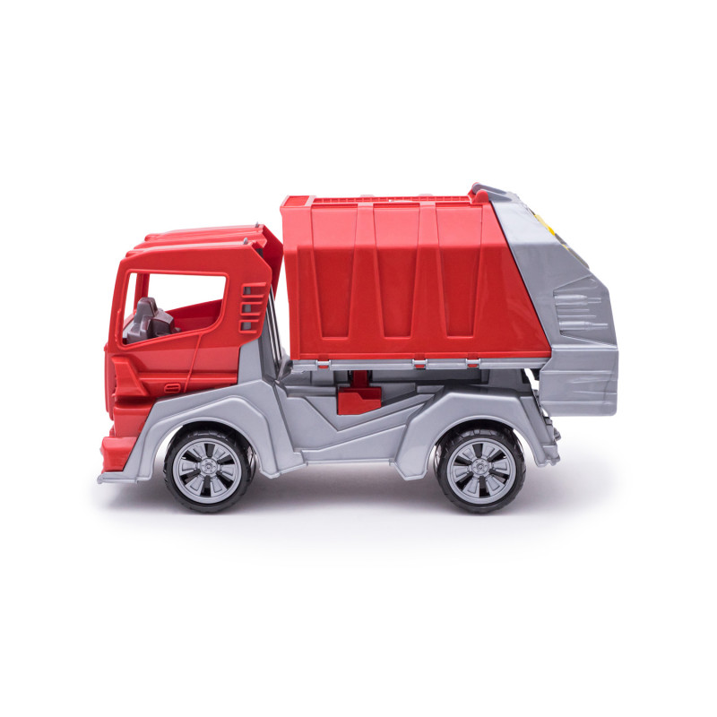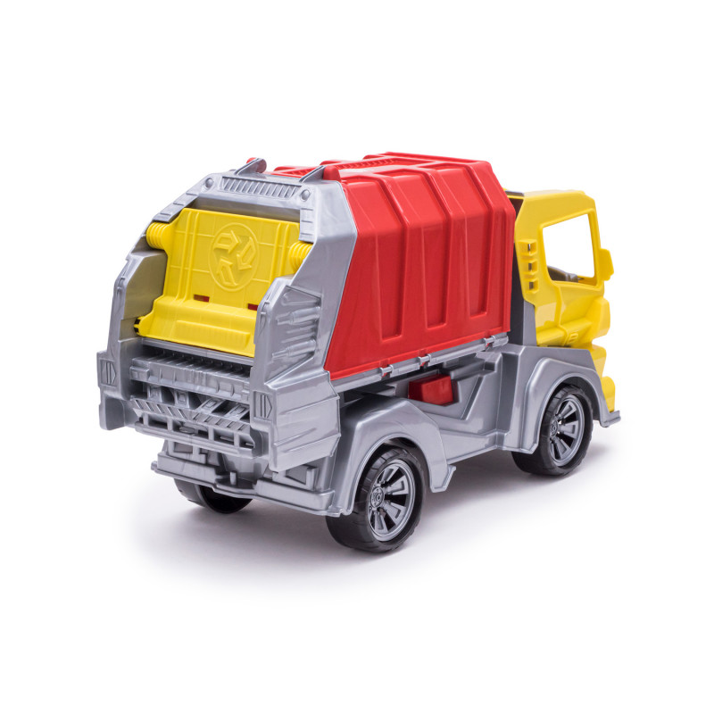 Данная модель игрушки изготавливается на основе предыдущей модели с арт. 018, но вместо кузова самосвала на шасси устанавливается платформа мусоровоза с крышкой и опрокидывателем. На опрокидыватель устанавливается и фиксируется контейнер для мусора с крышкой. Контейнер с крышкой с помощью ручек опрокидывателя поднимается, крышка контейнера открывается и мусор высыпается в кузов. Все детали изготавливаются из полипропилена.