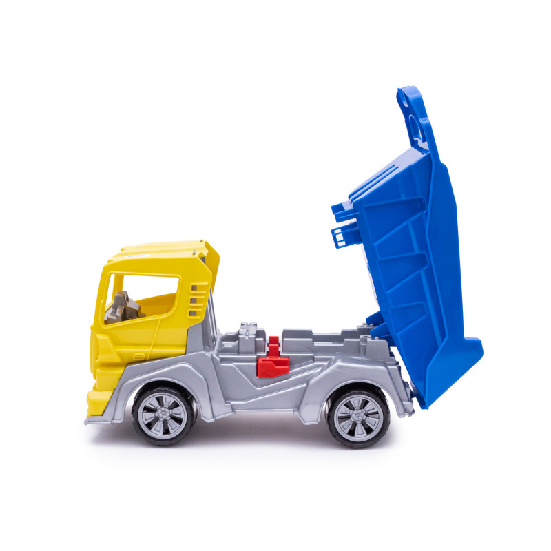 Данная модель игрушки изготовляется на основе двухосного шасси с двумя сиденьями. Игрушка имеет 4 колеса на 2-х осях, которые устанавливаются на кронштейны шасси. Колёса имеют декоративные колпаки. На шасси устанавливается кабина. Кабина с двух сторон имеет зеркала заднего вида, спереди – бампер в виде ребристой поверхности, отверстия для двух фар шасси. На шасси устанавливается кузов самосвала, который можно застопорить фиксатором установленным в средней части шасси. Все детали изготавливаются методом литья под давлением из полипропилена.